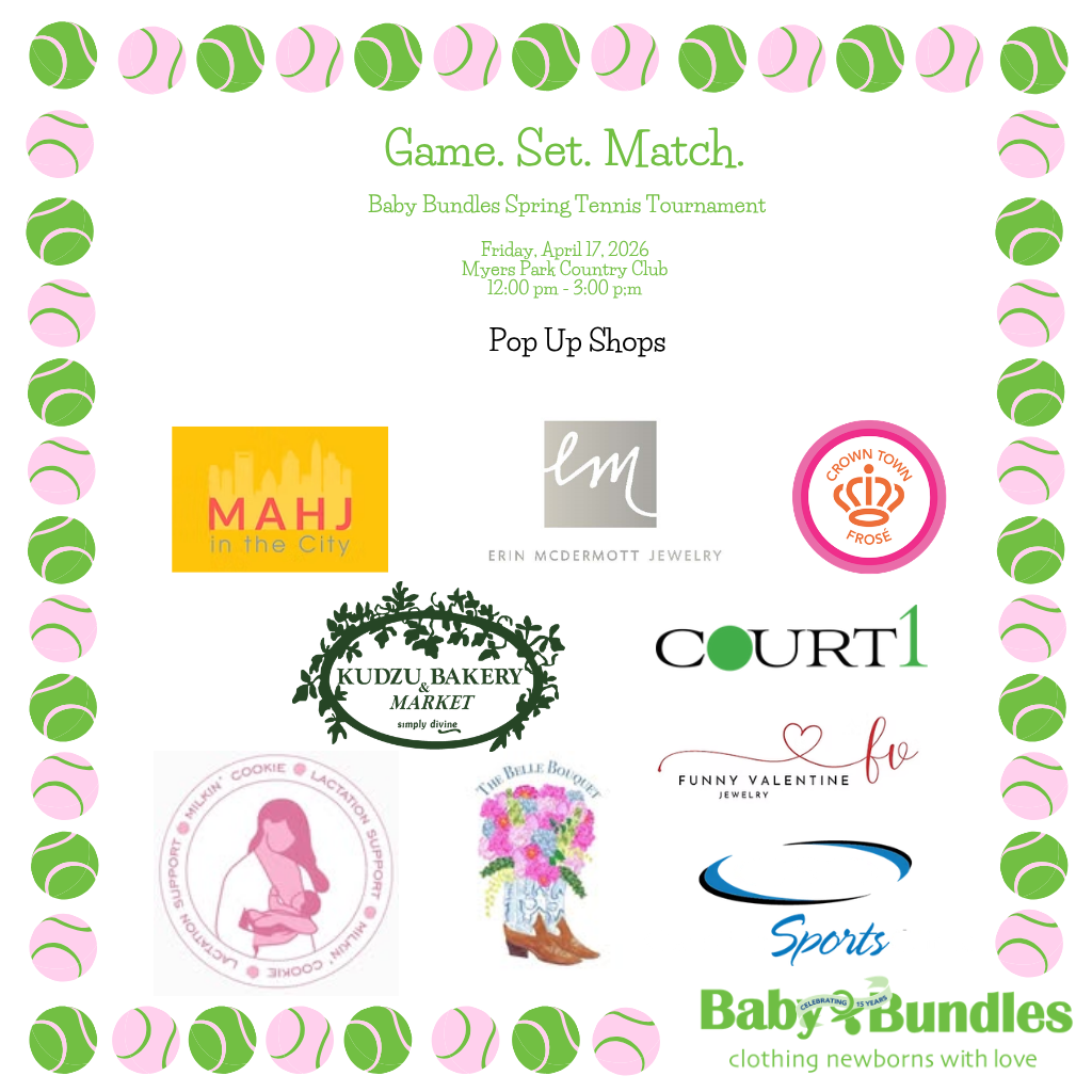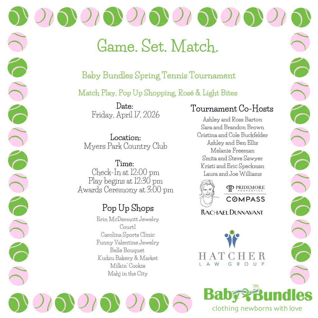 Game, Set. Match. SAVE THE DATE! Join us for our Spring Tennis Tournament!Match Play, Pop Up Shopping, Rosé & Light Bites We are on a waitlist! To add your name, please email vbirch@babybundlesnc.org