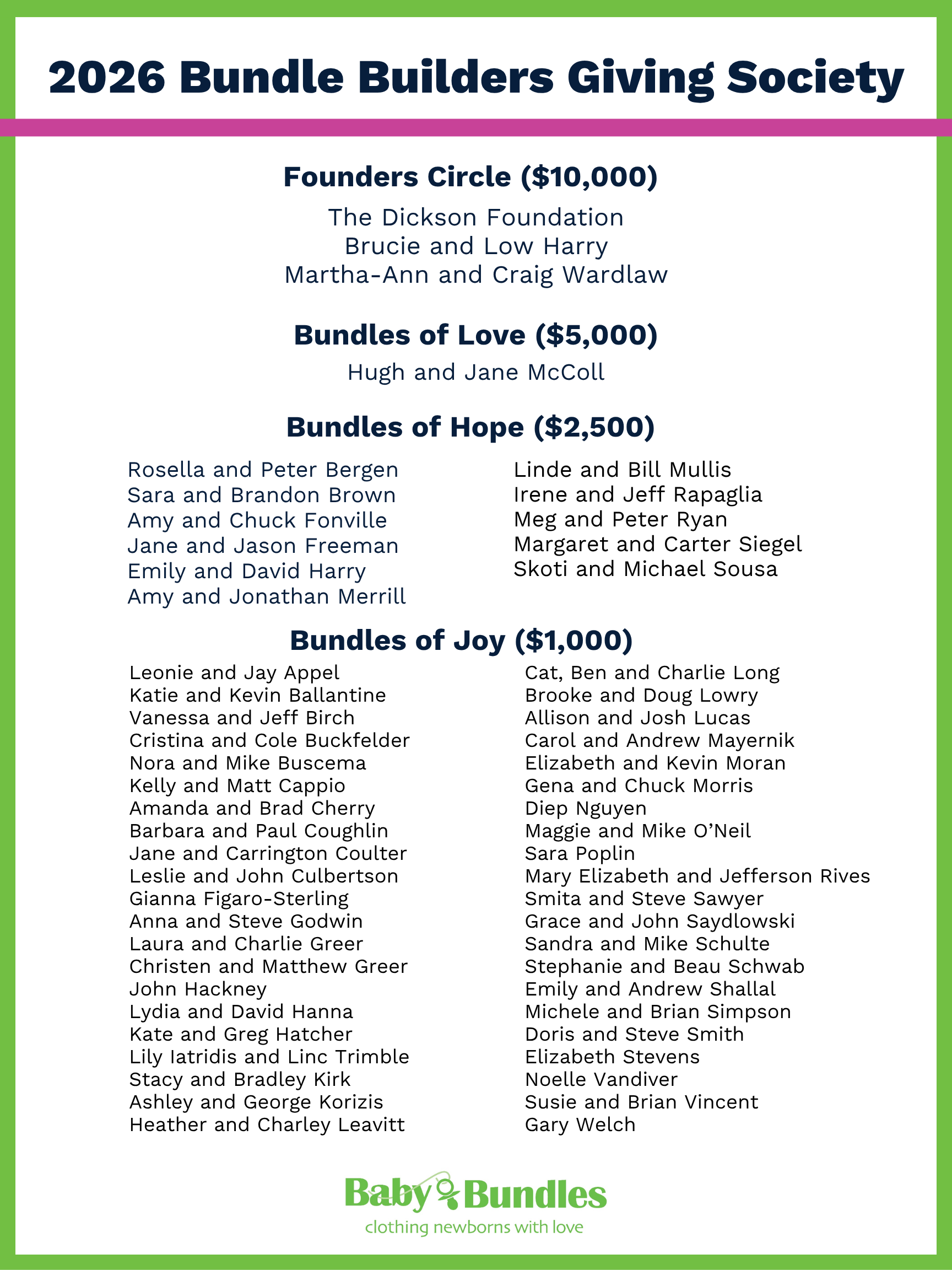 Baby Bundles established the Bundle Builders Giving Society in 2022. Inaugural members pledged their support with an annual donation ranging from $1,000 to $10,000 per year for 3 years.